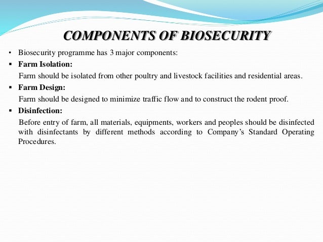 Animal biosecurity encompasses different means of prevention and containment of disease agents in a specific area. A critical element in animal biosecurity is biocontainment – the control of disease agents already present in a particular area and work to prevent transmission. Animal biosecurity may protect organisms from infectious agents or noninfectious agents such as toxins or pollutants, and can be executed in areas as large as a nation or as small as a local farm.